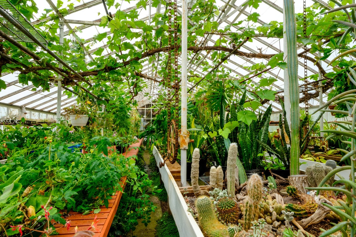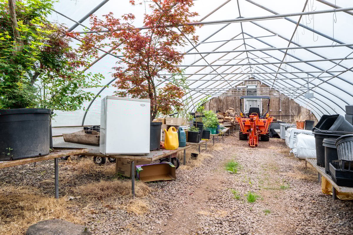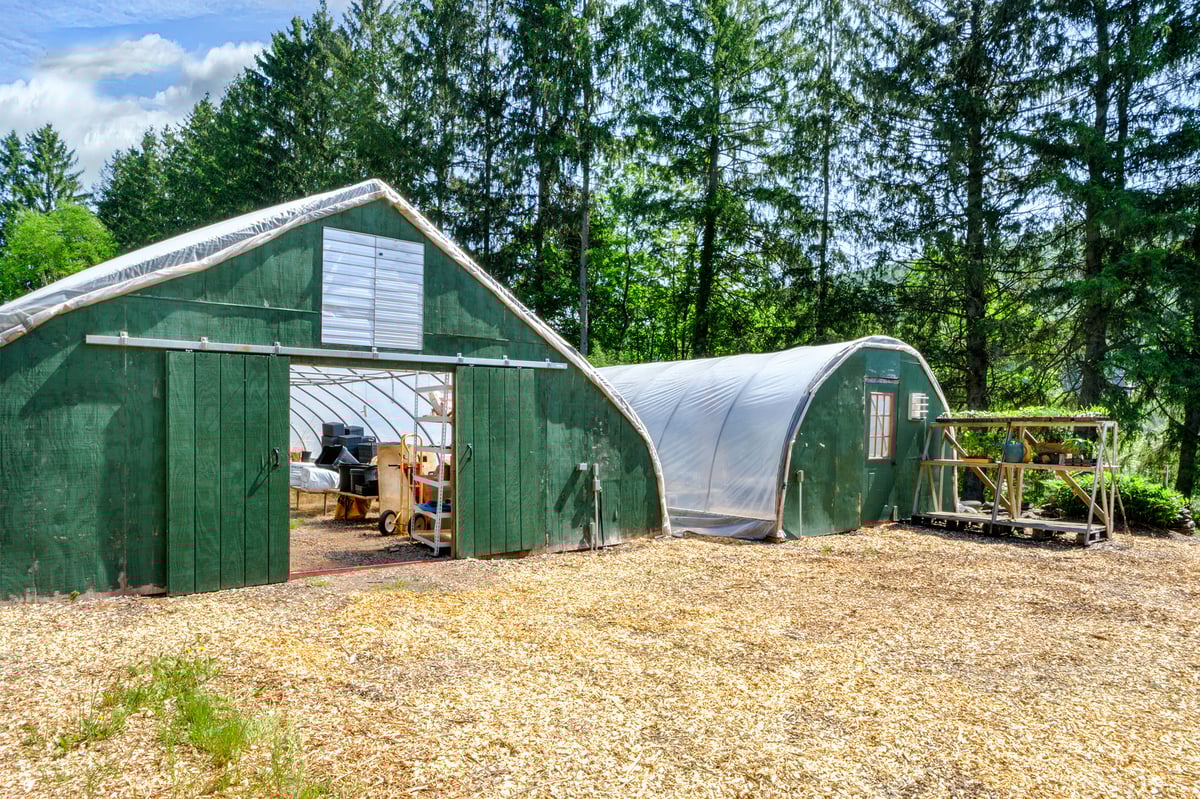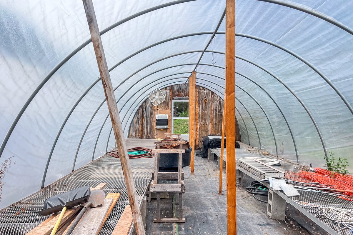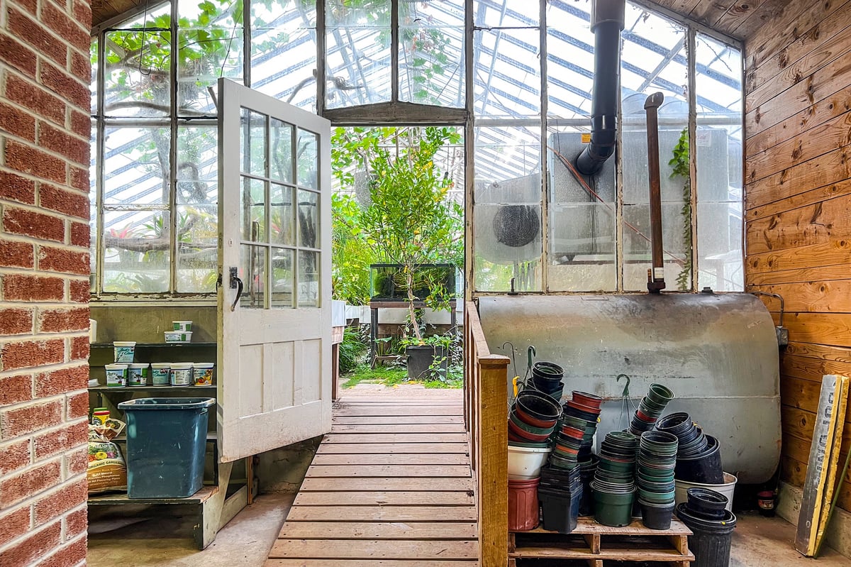 The main greenhouse, a classic Lord & Burnham glass structure measuring 76 by 25 feet, houses a prominent grape vine that winds through the space. At the far end of the atrium, a comfortable potting studio is heated by a wood stove. A second smaller Lord & Burnham greenhouse, modern hoop-style growing spaces, and numerous outdoor garden beds, including water-lily beds, add expansive options for horticulture projects.