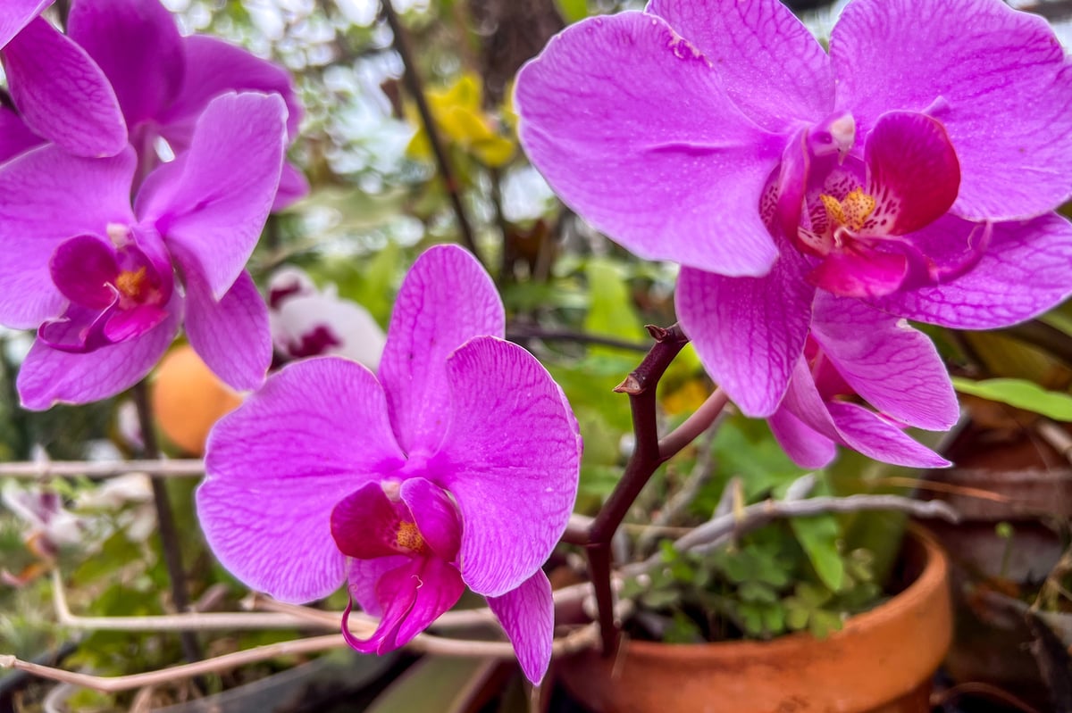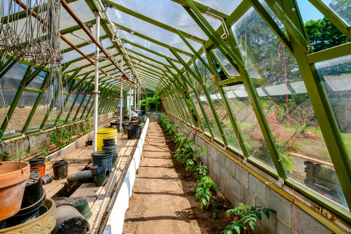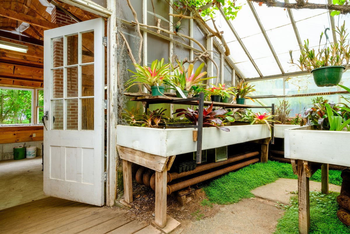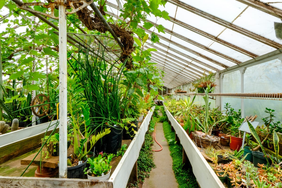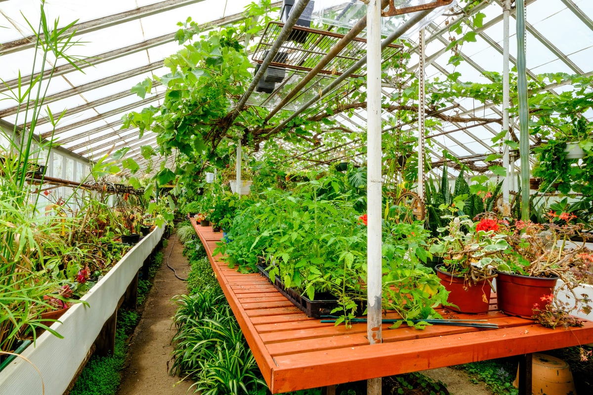 The main greenhouse, a classic Lord & Burnham glass structure measuring 76 by 25 feet, houses a prominent grape vine that winds through the space. At the far end of the atrium, a comfortable potting studio is heated by a wood stove. A second smaller Lord & Burnham greenhouse, modern hoop-style growing spaces, and numerous outdoor garden beds, including water-lily beds, add expansive options for horticulture projects.