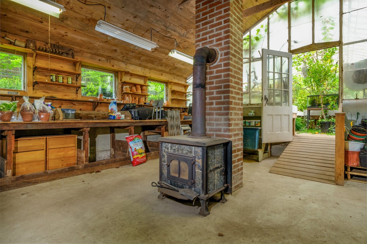 The 2-story building features impressive workspaces, a convenient half-bath, a dedicated private office, and a new glass-walled extension with a wood stove that functions as a four-season office or display room. Buyers can consider a public storefront or retain these areas for entrepreneurial projects.