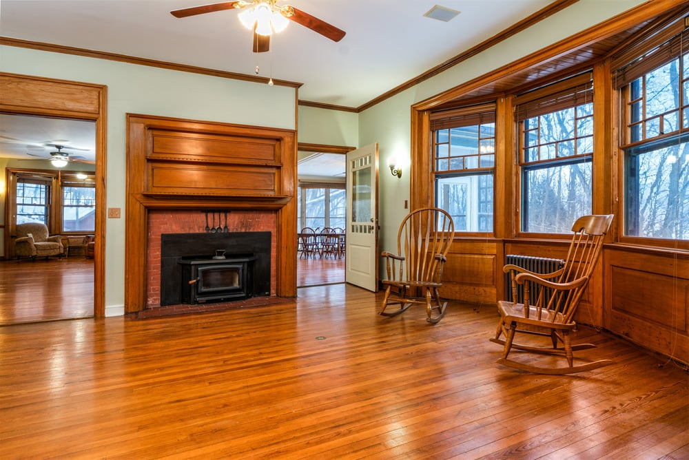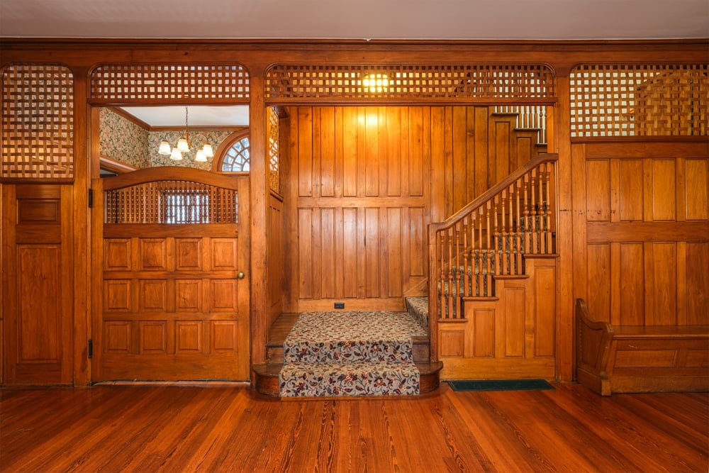 Inside, over 70 windows fill the interiors with natural light, highlighting rich finishes of oak, maple, and butternut wood. Every space has been thoughtfully updated with designer-led enhancements, including period lighting, custom wallpapers, bespoke cabinetry, and artisanal woodwork. Elegant fireplaces with beaded moldings anchor the main living areas, while flexible gathering spots—such as the turret library, front porch, and 3-season room—invite relaxation and entertaining year-round. While there are numerous details to captivate your attention, it’s the impressive mill work that catches your attention first. Warm wood tones with simple, yet elegant designs grace the stunning front entrance door, with its lattice of carved bead work, and the wainscotting along the unusual split staircase delivering guests to the second floor.