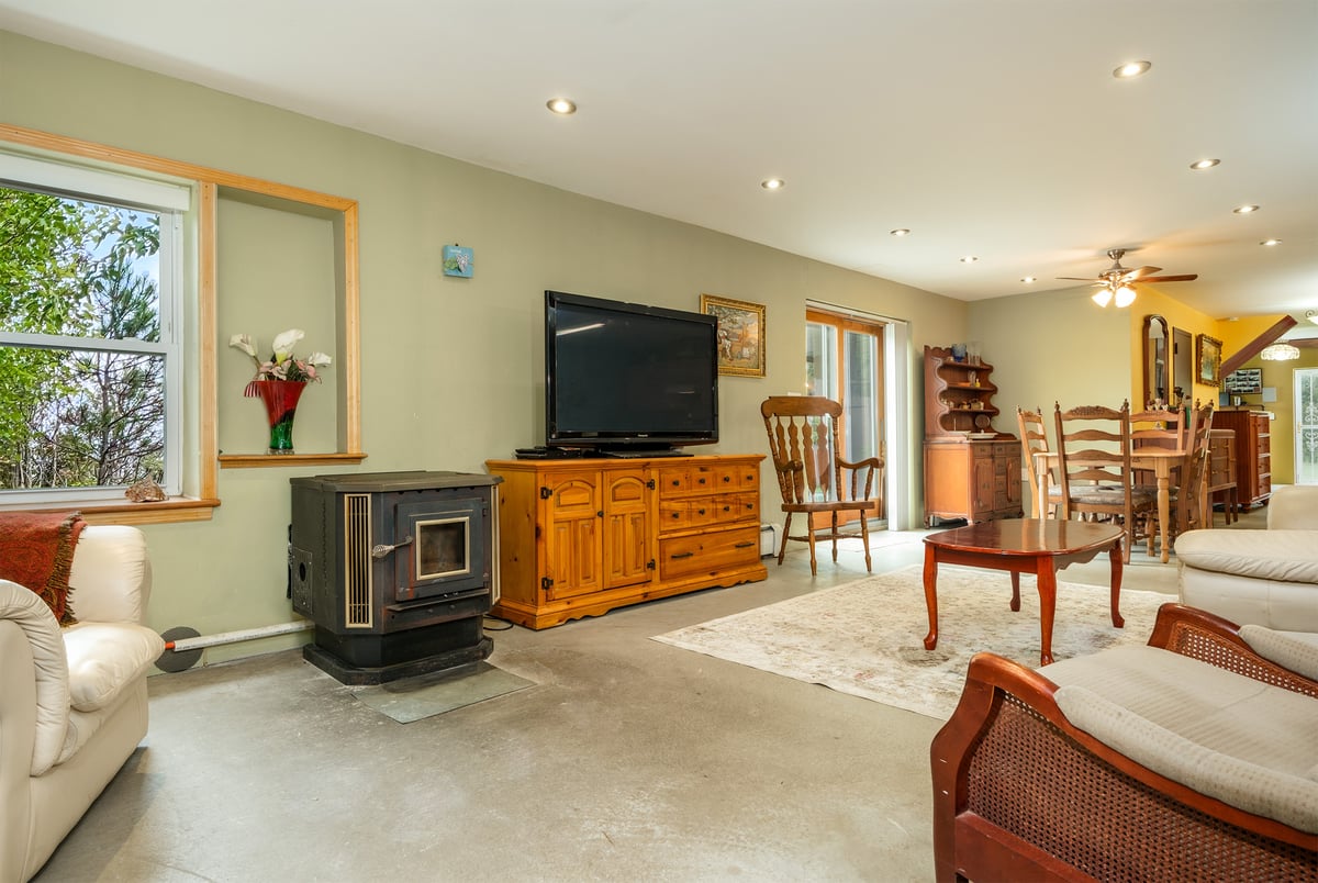 The inviting living room has large windows that bring the mountain views inside and is anchored by a cozy wood-burning stove set dramatically into the corner of the room.