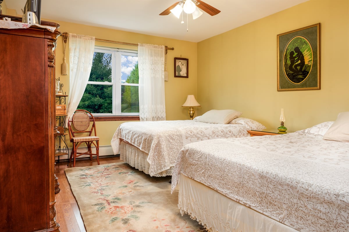 The ground floor features a private apartment-like setup, ideally suited for guests or multigenerational living. The open floor plan starts with a galley kitchen, breakfast peninsula and a dedicated dining area with a slider to the garden patio. A pool table and wet bar are the capstone to the perfect entertainer's space. This space includes a generously sized bedroom with large cedar lined closets, a full bathroom complete with necessary amenities, including a dedicated laundry area featuring a washing machine and slop sink to streamline daily tasks. Towards the rear of the space are two more rooms that could be additional bedrooms, office or pantry / sewing room and sporting room. A rear door opens out to the back patio and trails to the woods and creek.